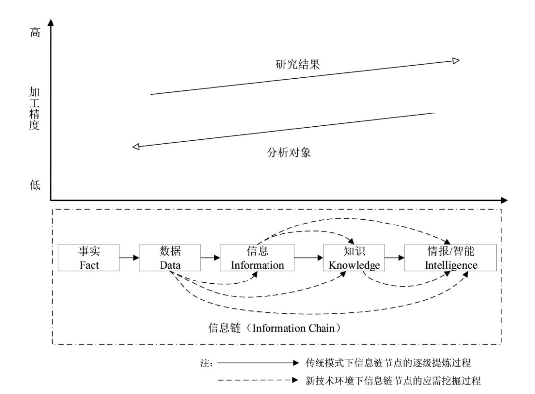 从信息链视角考虑,新技术影响下图书情报工作的工作流程正在发生重构。“信息链”(Information Chain)由事实(Fact)—数据(Data)—信息(Information)—知识(Knowledge)—情报/智能(Intelligence)五个要素构成(见图1)。传统图书情报工作流程是沿着信息链进行逐级提炼升华,更多集中在信息加工为知识这一环节,新技术的融入扩展了图书情报工作的“起点”和“终点”,改变了传统图书情报工作沿着信息链逐级提炼升华的流程。在新模式下,图书情报工作可以根据需求从信息链上任意节点入手进行知识挖掘,而不是过去的逐级萃取。新技术为图书情报工作提供了全新的数据环境和计算环境。相较传统图书情报工作,新技术环境下的图书情报工作的加工精度进一步提高。一方面,图书情报工作的分析对象由“信息”上溯到“数据”,借助大数据挖掘技术,从海量“数据”中挖掘出用户所需的知识和情报;另一方面,依托大数据、云计算和人工智能等新技术,图书情报工作的重心从对信息和知识的简单组织,转向对数据和信息分析的结果进行综合和提炼,形成支持决策的智能和解决方案。